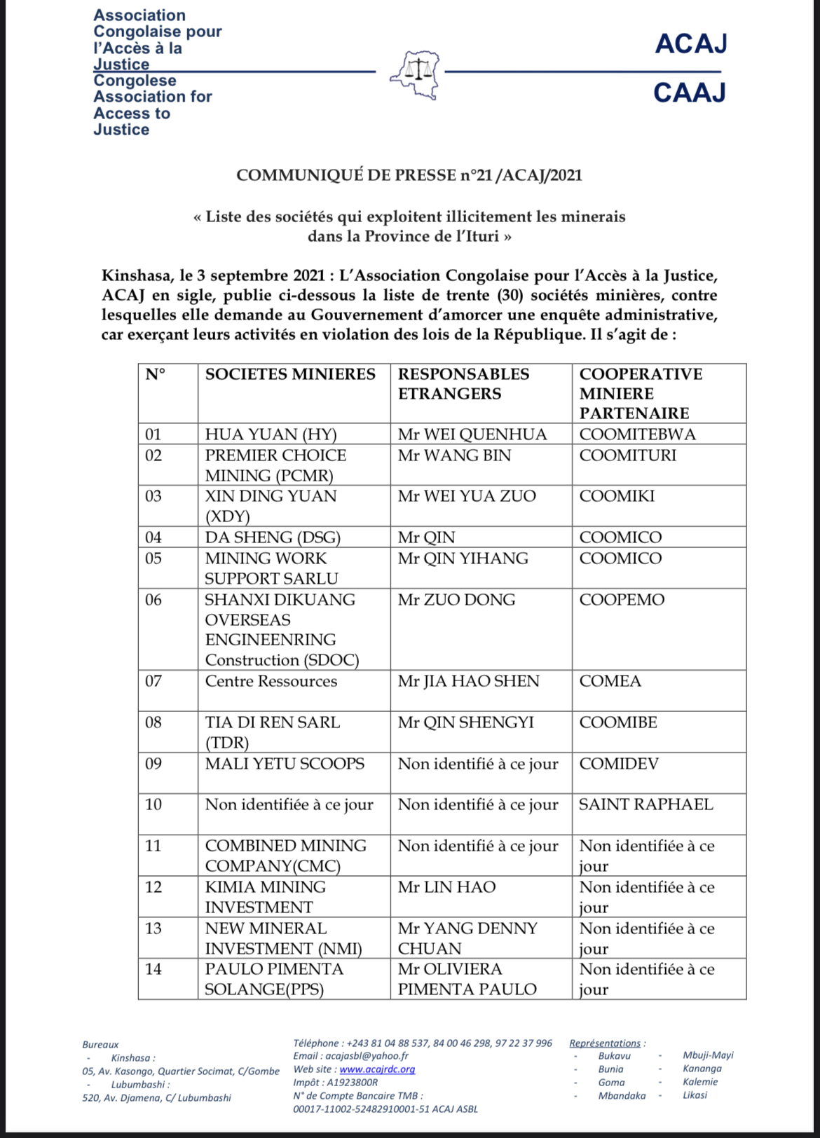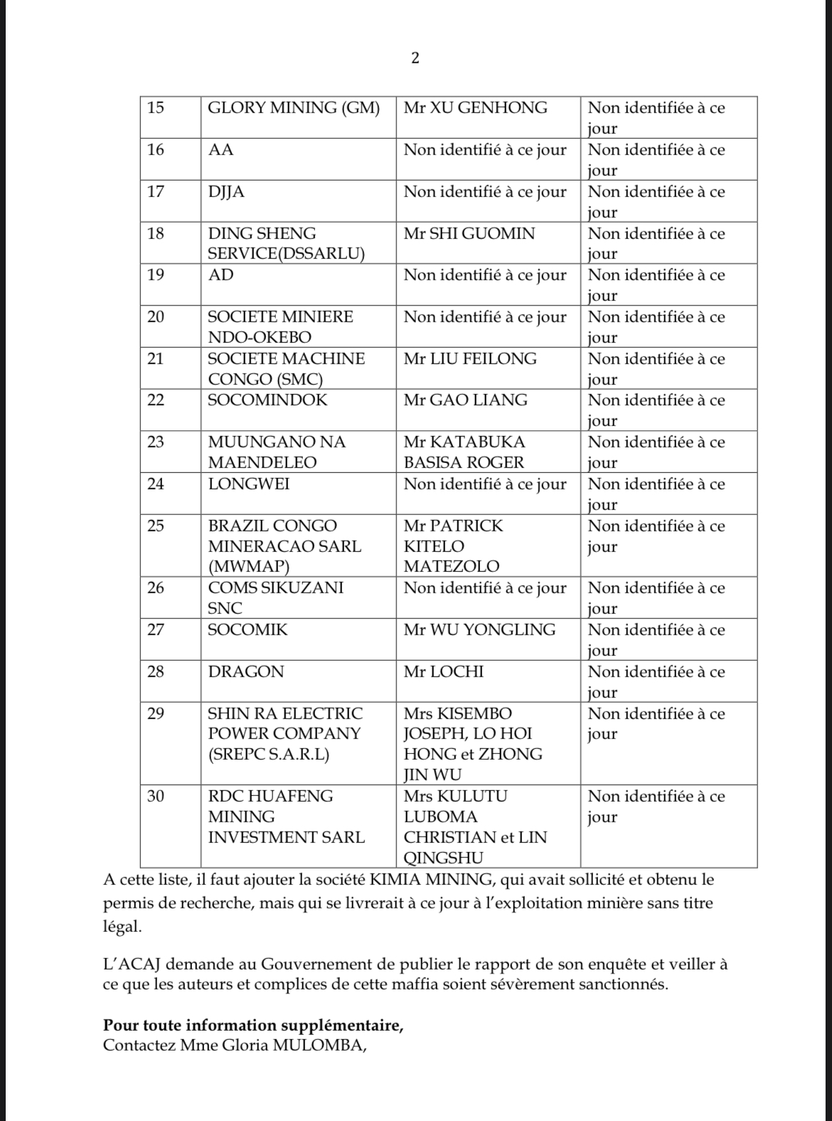 Ce vendredi 3 septembre, cette structure congolaise a rendu publique une liste de 30 sociétés qu’elle accuse d’exploiter illégalement des minerais dans cette partie du territoire national. L’ACAJ a également épinglé la société KIMIA MINING. « Cette Société avait sollicité et obtenu le permis de recherche, mais s’adonne aujourd’hui à l’exploitation minière sans titre légal » a-t-elle dénoncé.