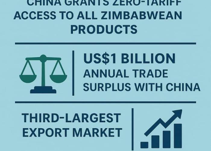 La Chine s'est engagée à imposer des droits de douane nuls sur tous les produits Zimbabwéens, une mesure qui devrait stimuler les exportations alors que le Zimbabwe bénéficie actuellement d'un excédent commercial annuel d'un milliard de dollars avec Pékin.
