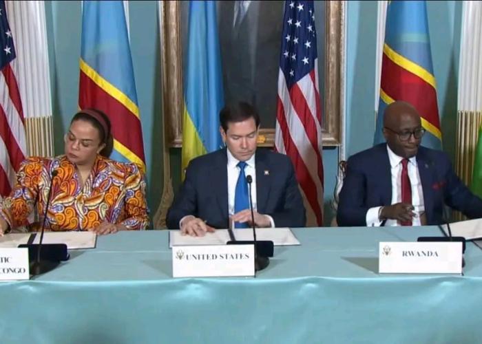 « Le secrétaire d’État Marco Rubio a présidé la signature d’une déclaration de principes entre le gouvernement de la République Démocratique du Congo (RDC) et le gouvernement de la République du Rwanda. La ministre des Affaires étrangères Thérèse Kayikwamba Wagner a signé au nom du gouvernement de la RDC, tandis que le ministre des Affaires étrangères Olivier Nduhungirehe a signé au nom du gouvernement du Rwanda. Le secrétaire d’État adjoint Christopher Landau, le conseiller principal pour l’Afrique Massad Boulos et l’ambassadeur Troy Fitrell se sont également joints au secrétaire Rubio pour cette occasion », annonce l'ambassade des États-Unis en République Démocratique du Congo.