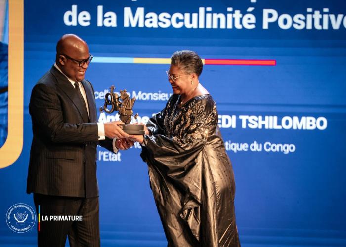 Lors de la cérémonie de la Journée nationale de la masculinité positive, la Première Ministre, Cheffe du Gouvernement, Judith Suminwa Tuluka, a procédé mardi 31 mars à la remise symbolique du trophée de la masculinité positive au Président de la République, Félix-Antoine Tshisekedi Tshilombo.