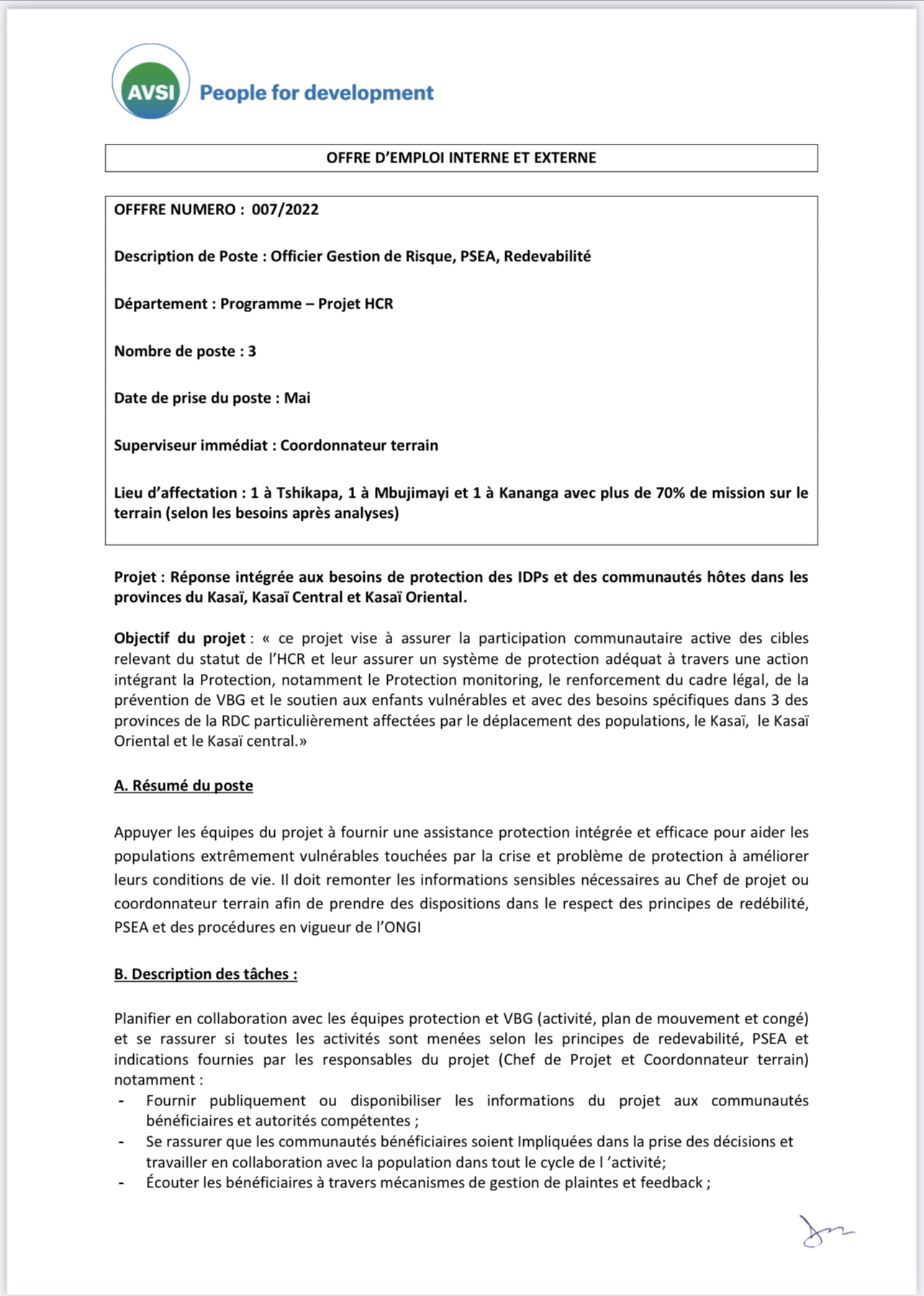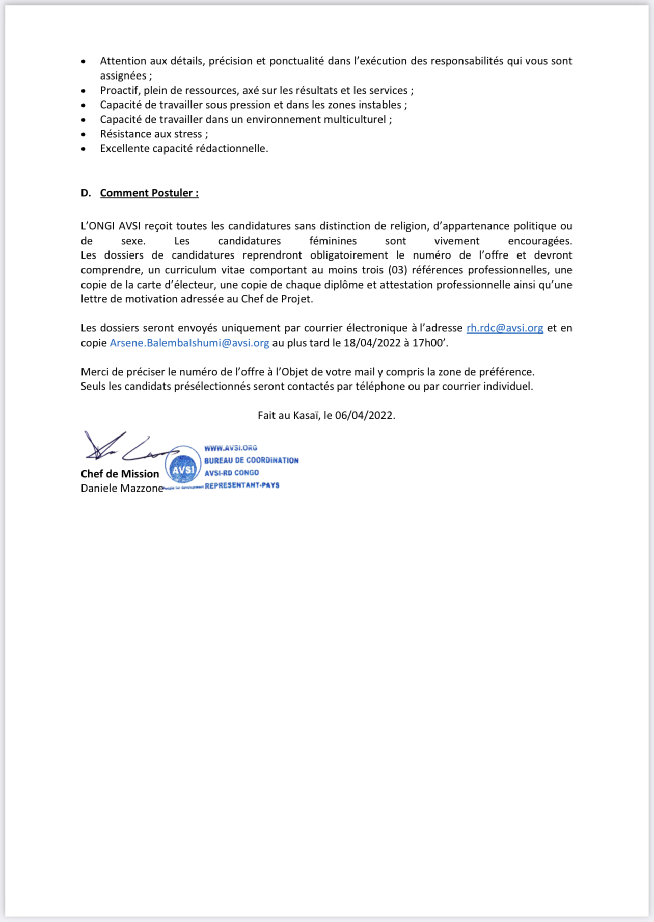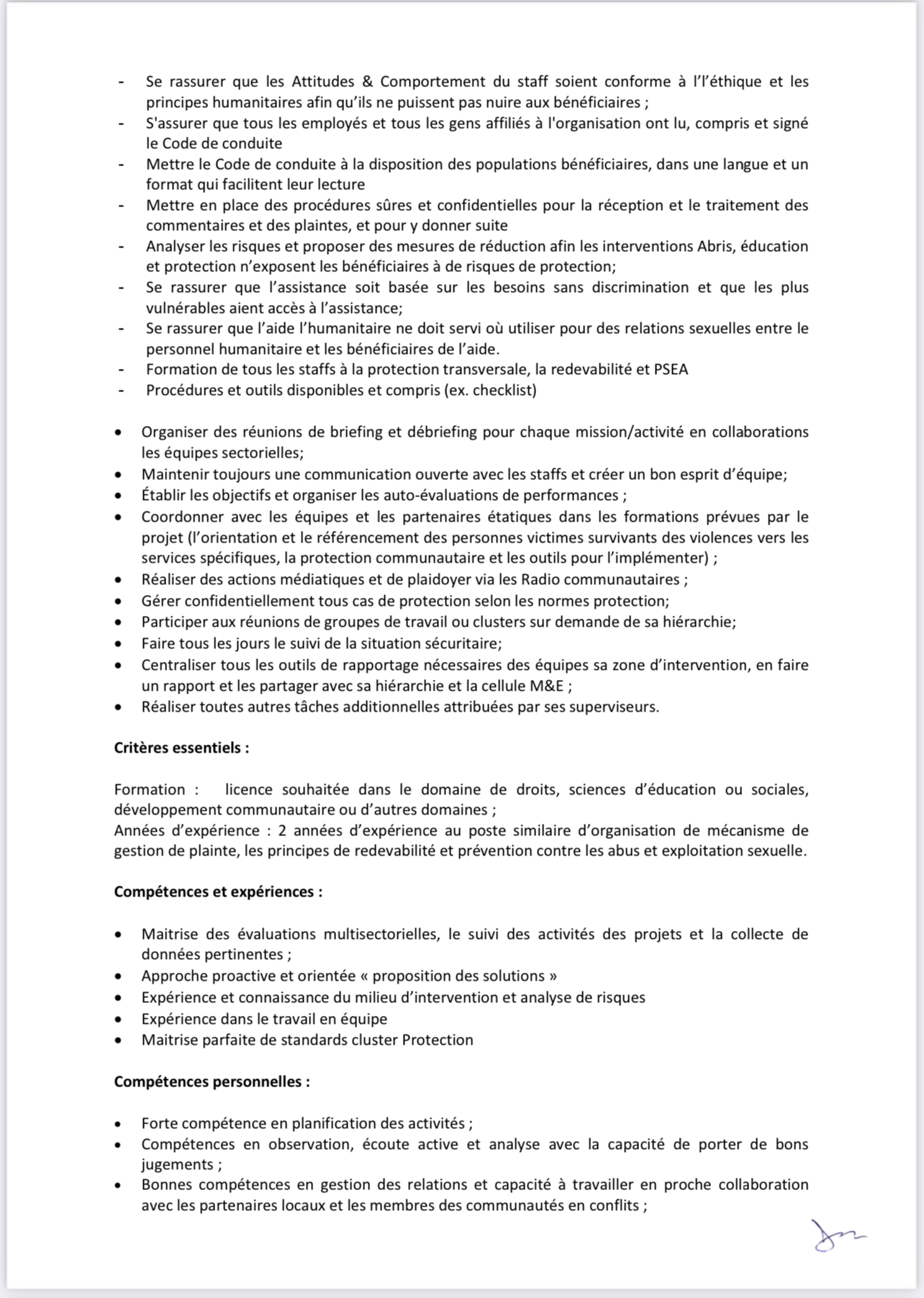 Appuyer les équipes du projet à fournir une assistance protection intégrée et efficace pour aider les populations extrêmement vulnérables touchées par la crise et problème de protection à améliorer leurs conditions de vie. Il doit remonter les informations sensibles nécessaires au Chef de projet ou coordonnateur terrain afin de prendre des dispositions dans le respect des principes de redébilité, PSEA et des procédures en vigueur de l’ONGI AVSI.