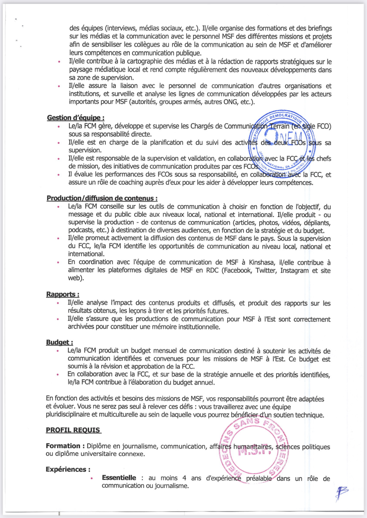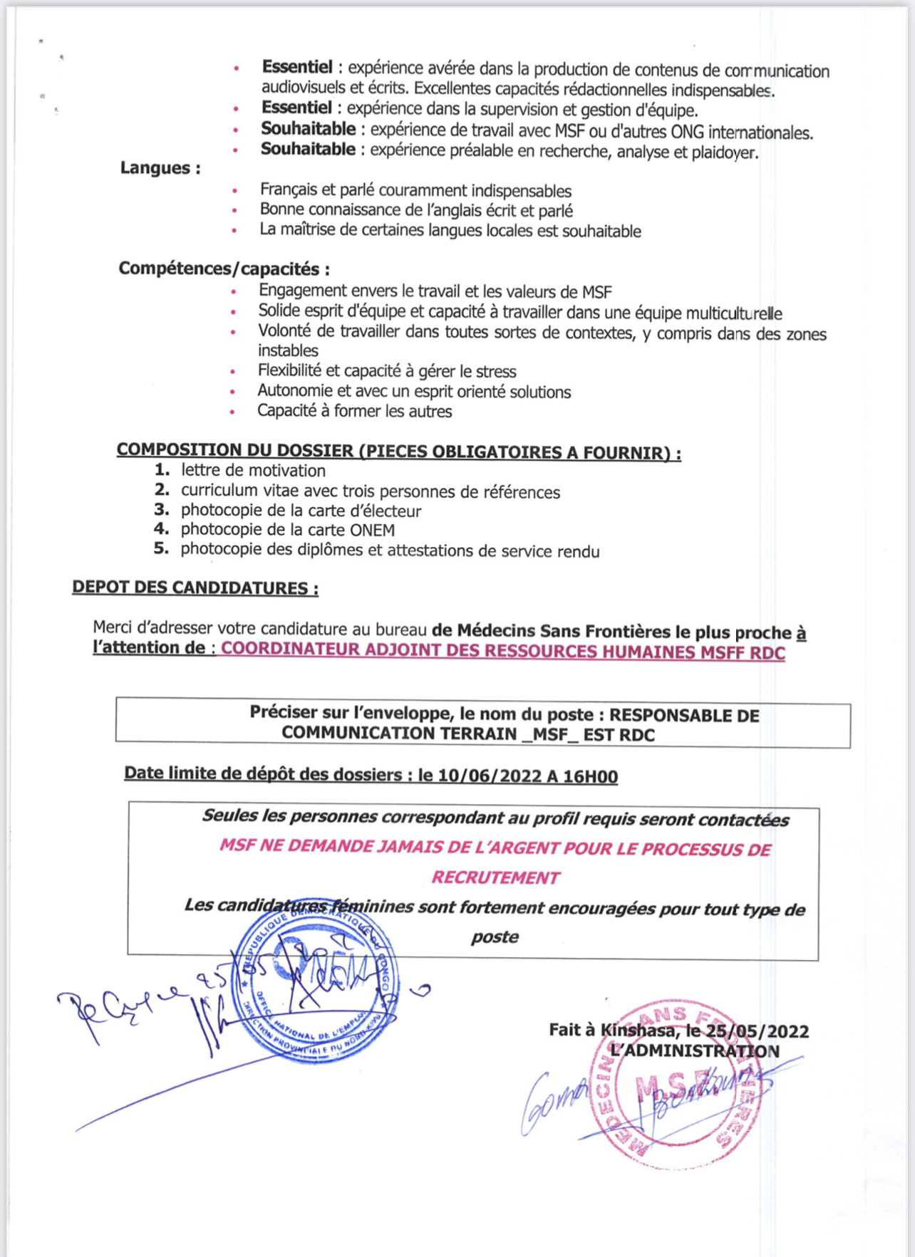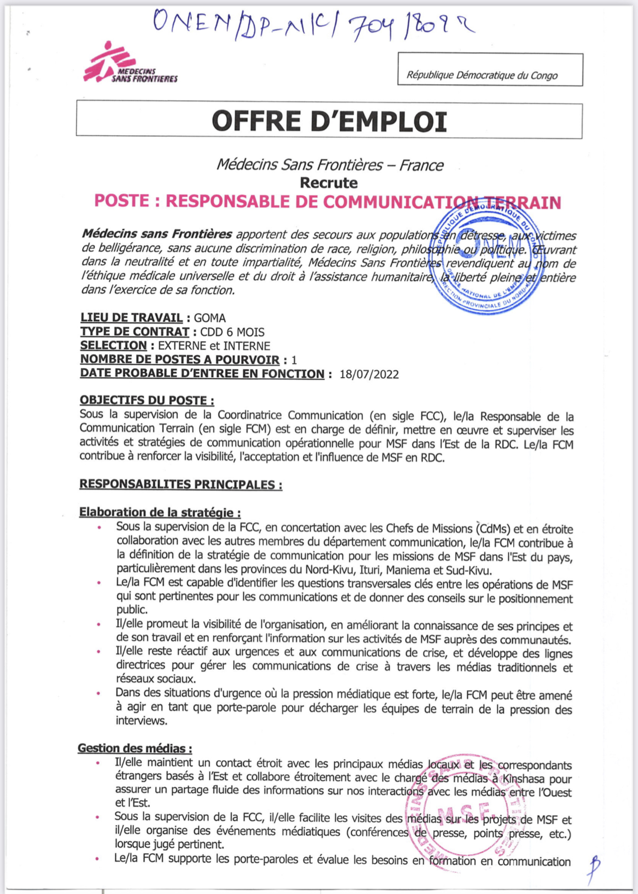 EMPLOI : MSF recrute un responsable de communication terrain pour Goma