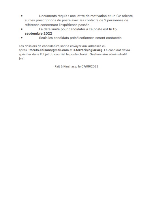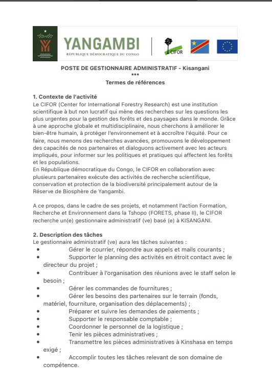 OFFRE D’EMPLOI : CIFOR recrute un Gestionnaire Administratif – Kisangani