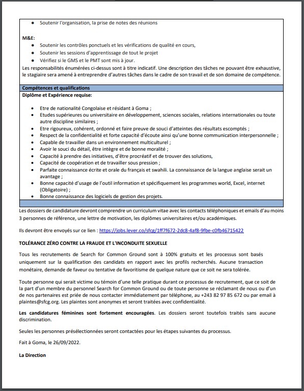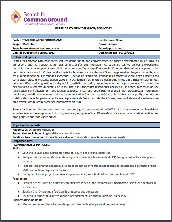 OFFRE D’EMPLOI : Search for Common Ground recrute un stagiaire appui programme