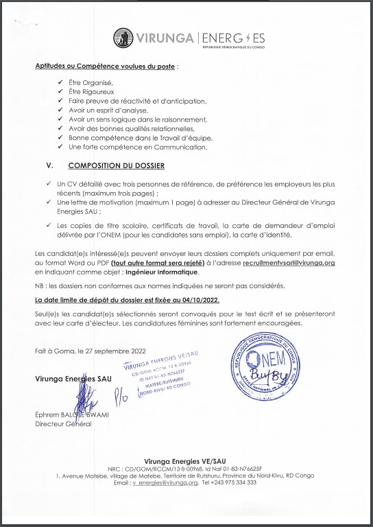 OFFRE D’EMPLOI : VIRUNGA ENERGIES recrute un Ingénieur Informatique