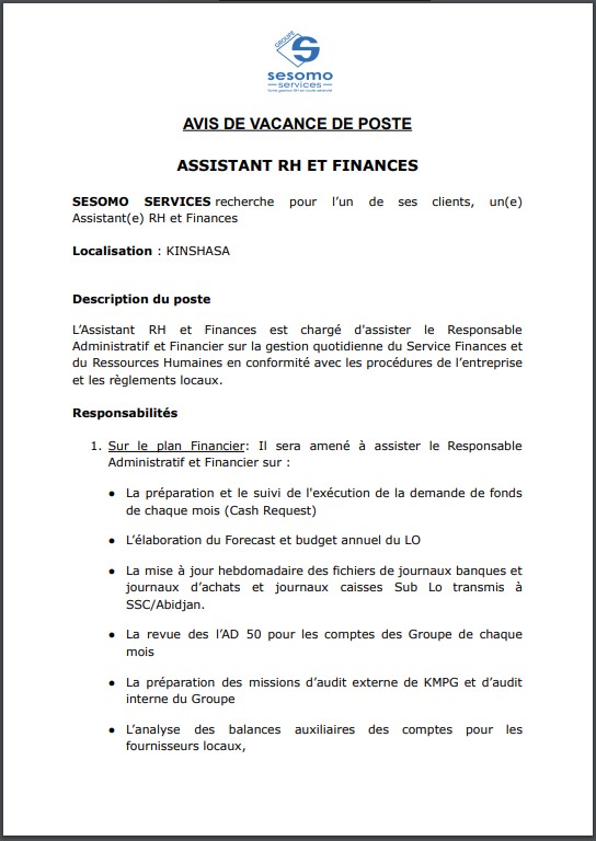 OFFRE D’EMPLOI : SESOMO recrute un(e) Assistant(e) RH et Finances