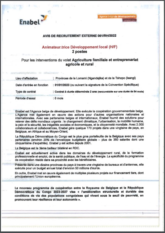 OFFRE D’EMPLOI : Enabel recrute un Animateur(trice) Développement local (H/F)