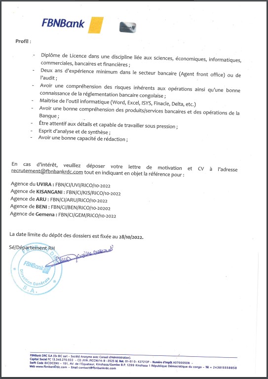 <p>OFFRE D’EMPLOI : FBNBank recrute 5 contrôleurs internes</p> Lundi 24 octobre 2022 | Offre d'emplois