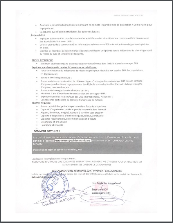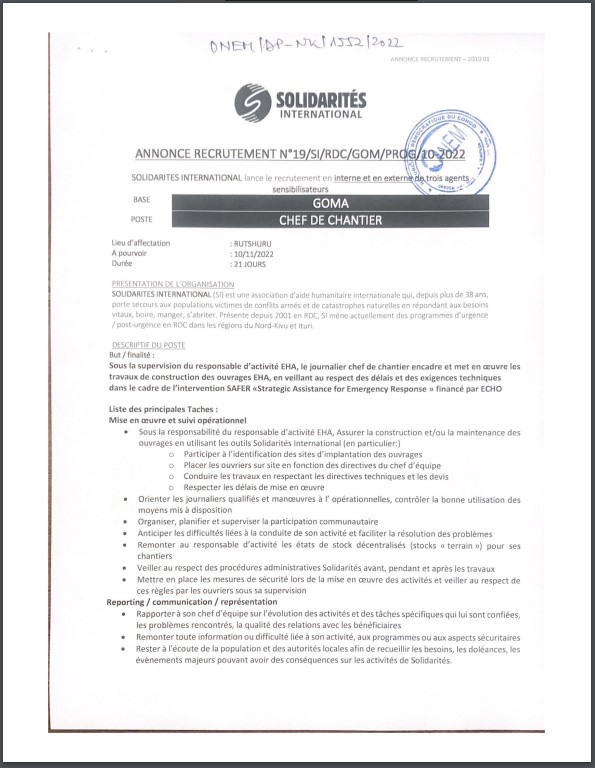 SOLIDARITES INTERNATIONAL (SI) est une association d’aide humanitaire internationale qui, depuis plus de 38 ans, porte secours aux populations victimes de conflits armés et de catastrophes naturelles en répondant aux besoins vitaux, boire, manger, s’abriter, Présente depuis 2001 en RDC, SI mène actuellement des programmes d’urgence/post-urgence en RDC dans les régions du Nord-Kivu et Ituri. SOLIDARITES INTERNATIONAL recrute le journalier chef de chantier encadre et met en œuvre les travaux de constructions des ouvrages EHA, en veillant au respect des délais et des exigences techniques dans le cadre de l’intervention SAFER « Strategic Assistance for Emergency Response » financé par ECHO.