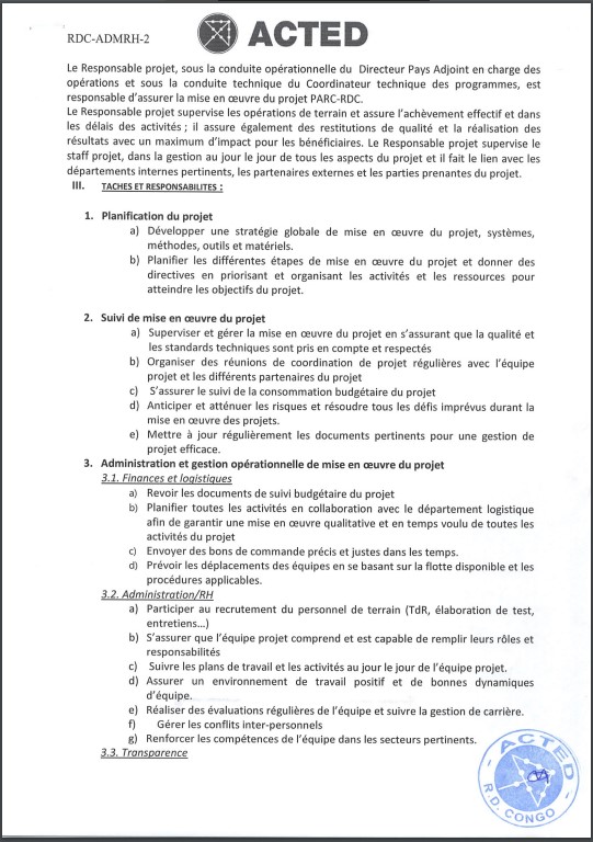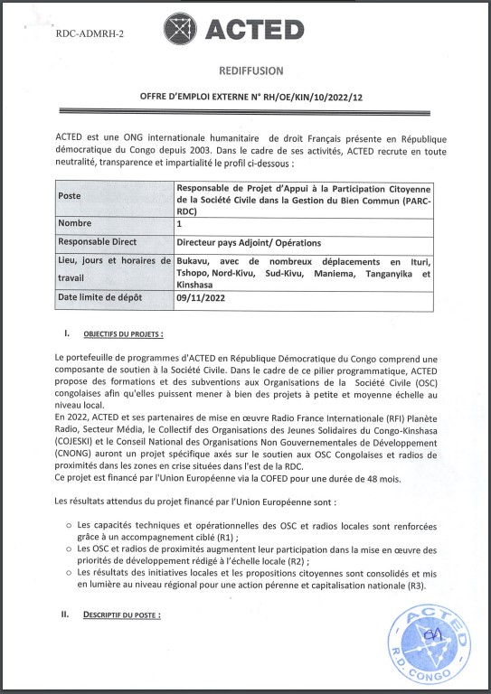 <p>OFFRE D’EMPLOI : ACTED recrute un Responsable de Projet d’appui à la Participation Citoyenne de la Société Civile dans la Gestion du Bien Commun (PARC-RDC)</p>
