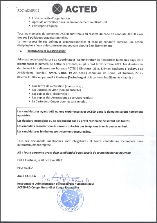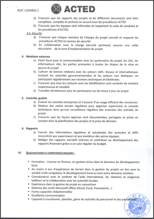 ACTED est une ONG Internationale humanitaire de droit Français présenté en République Démocratique du Congo depuis 2003. Dans le cadre de ses activités, ACTED recrute en toute neutralité, transparence et impartialité le profil ci-dessous :