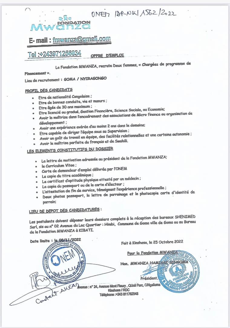 <p>La Fondation MWANZA, recrute Deux femmes, « Chargées de programme de Financement »</p> Jeudi 10 novembre 2022 | Offre d'emplois