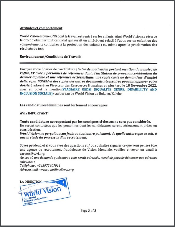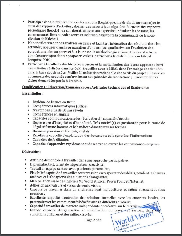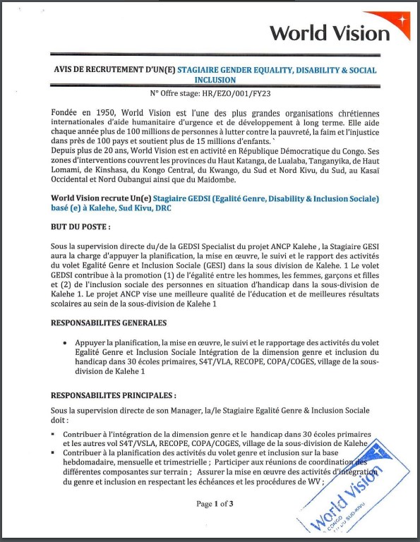 Sous la supervision direct du /de la GEDSI Specialist du projet ANCP Kalehe, la Stagiaire GENDER EQUALITY, DISABILITY & SOCIAL INCLUSION aura la charge d’appuyer la planification, la mise en œuvre, le suivi et le rapport des activités du volet Egalité Genre et Inclusion Sociale (GESI) dans la sous division de Kalehe.