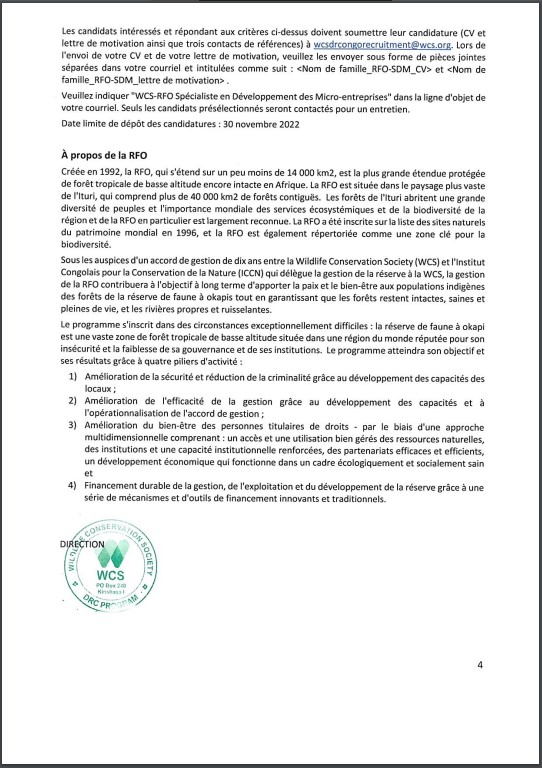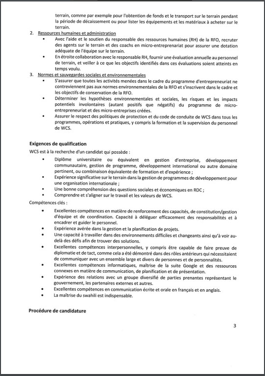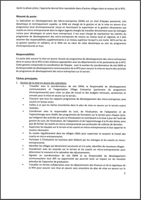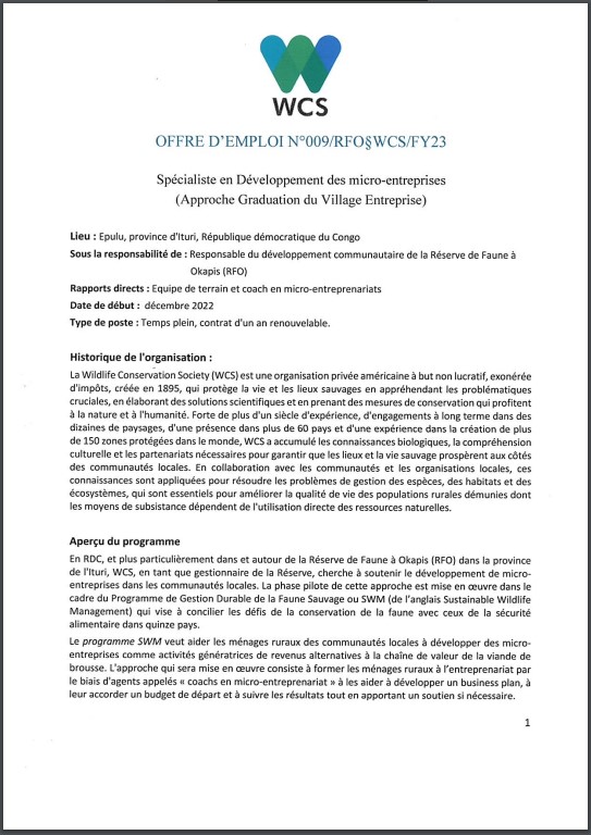 OFFRE D’EMPLOI : La Wildlife Conservation Society recrute Un Spécialiste en Développement des micro-entreprises