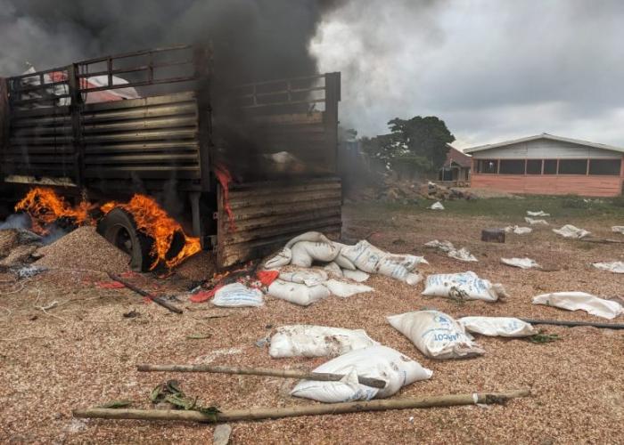 Des éléments armés de la coopérative pour le développement de l'Ituri (CODECO) au pris d'assaut un véhicule de PAM (Programme Alimentaire Mondial), en territoire de Djugu, province de l'Ituri. En provenance de la Tanzanie, ce véhicule a été incendié par les insurgés sur la route nationale Numéro 27, tronçon Djugu-Fataki.